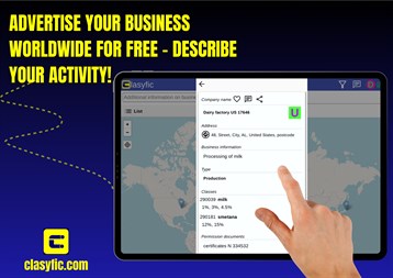 How to present your business in the Clasyfic? Users register their account, then enter information about their business by choosing a type of activity linked to the international classifier of goods and services with the possibility of a more detailed description of products or services, indicate their location linked to a map, enter data about their company and contacts.