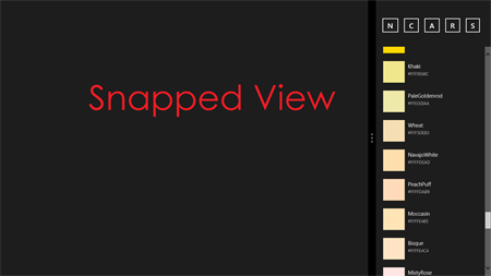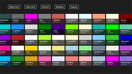Colors Panel cleanly and smoothly displays all the colors available to developers in the Windows.UI.Color class. Along with the color, the name and hex code is also displayed.