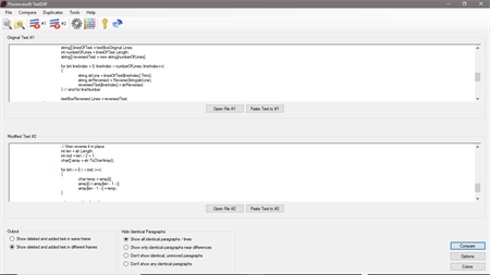 Compares text files and folders. Florencesoft TextDiff finds the differences between two plain text files, such as source code, XML and scripts. It can compare text for articles, dissertations, reports and essays. It will also compare two folders and report new, deleted and modified files. It is ideal for software developers who want to see what has changed between two hierarchal directories of text files. It will also compare Microsoft Word and Rich Text Format files, although it will not compare their formatting, tables, graphics or pictures. For the former, Microsoft Word has to be installed as a desktop application. You can supply the text to be compared by drag and drop or by pasting in text directly from the clipboard. As such it is a fast way to compare any text that you can copy to the clipboard from any document type you can open on your computer. It uses a truly novel text difference algorithm that can distinguish between a change caused by text being moved up or down in a document from a deletion or addition. We offer a free trial for 7 days so you can evaluate the software before deciding whether you want to purchase it.