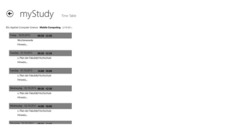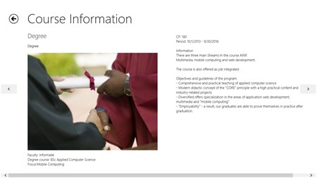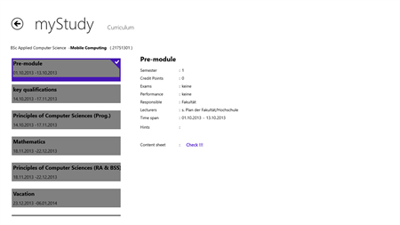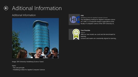 The app gives a brief overview of the study according to the "core principle". It is aimed particularly at students of the SRH University Heidelberg. Depending on the course and focus the curriculum can be viewed with appropriate details. In addition, you get information about the aimed degree. Daily Time Table (somehow like a schedule) for a block can be viewed.