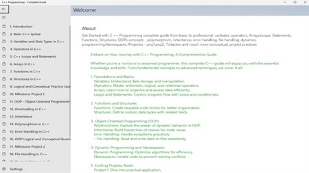 Get started with C ++ Programming complete guide which is from basic to professional level learning. variables, operators, Arrays, Loops, Statements, Functions, Structures, OOPs concepts - polymorphism, inheritance, error handling, file handling, dynamics programming, Namespaces, Projects - proj1, proj2, Tic-tac-toe and much more conceptual, project practices.