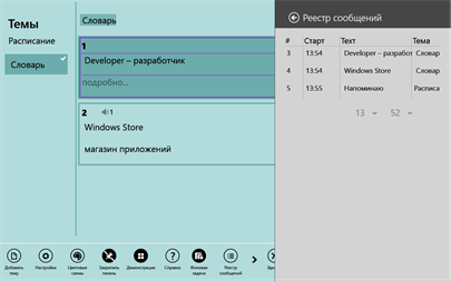 Возможности. ⦁ Группировка элементов информации по темам. ⦁ Выдача в фоновом режиме уведомлений без звука. ⦁ Выдача в фоновом режиме звуковых сообщений без отображения текста элемента. ⦁ Выдача предварительно озвученных уведомлений. ⦁ Озвучивание текста уведомления. ⦁ Вывод на экран реестра сообщений. ⦁ Перемещение данных на компьютеры с установленным приложением.