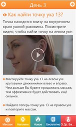 √ Вам больше не понадобятся требующие много времени визиты к врачу √ Не понадобятся ощутимые денежные затраты √ Отпадёт опасность внесения инфекции, повреждений тела или болей √ Вы мягко массируете точки пальцем руки √ Приложение автоматически напомнит Вам о нужном моменте массажа