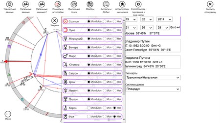 Список типов карт: 1) Транзитная/Натальная 2) Натальная + Транзитная 3) Синастрия (по выбранным натальным данным 1 и 2) 4) Вторичные прогрессии (натальная карта + 1 день = 1 год разницы между выбранными натальными данными и заданными транзитными данными) 5) Символические дирекции (натальная карта + 1° = 1 год разницы между выбранными натальными данными и заданными транзитными данными) 6) Дирекции по дуге солнца, луны или одной из планет (натальная карта + путь планеты в градусах за 1 день = 1 год разницы между выбранными натальными данными и заданными транзитными данными) 7) Профекции (натальная карта + 30° = 1 год разницы между выбранными натальными данными и заданными транзитными данными) 8) Возвращения Солнца, Луны, Меркурия, Венеры, Марса, Юпитера или Сатурна (по выбранным натальным данным и заданным транзитным данным, от которых считаются даты возвращений) 9) Фазовый Лунар (по выбранным натальным данным и заданным транзитным данным, от которых считаются даты возвращений) 10) Композитная (по выбранным натальным данным 1 и 2) 11) Средняя (по выбранным натальным данным 1 и 2) 12) Гармоники (по выбранным натальным данным или заданным транзитным данным)