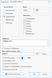 Free Alarm Clock автоматически увеличит громкость, если вы случайно отключите звук. При включении будильника программа может принудительно увеличить громкость Windows. Кроме того, вы можете установить удобную громкость звука.