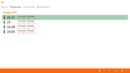 Индекс массы тела (англ. body mass index (BMI), ИМТ) — величина, позволяющая оценить степень соответствия массы человека и его роста и тем самым косвенно оценить, является ли масса недостаточной, нормальной или избыточной. Важен при определении показаний для необходимости лечения. ------- Приложение доступно на устройствах: Windows 10 и Windows Phone 8.1