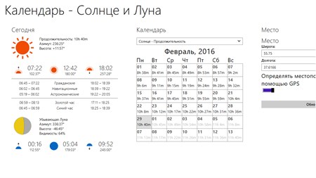 Приложение служит для определения положения небесных светил в любой точке мира, и поможет вам определить время восхода и заката, сумерек, продолжительность дня, фазу Луны и многое другое. С помощью данной программы вы можете прогнозировать наилучшее временя для фотосъемок пейзажей, природы, и любых других съемок на открытом воздухе, а так же различных астрономических наблюдений. Так же программа будет полезна для вычисления дней и часов максимальной активности животных и рыб в зависимости от положения луны и солнца на небе (время, когда луна находится в верхней и нижней точках своей орбиты относительно положения наблюдателя, а так же когда луна на полпути между ее верхней и нижней точками - см. Джон Алден Найт - «Солунарная теория»).