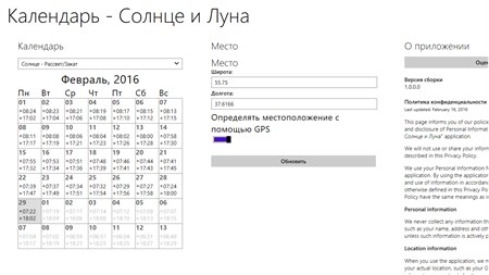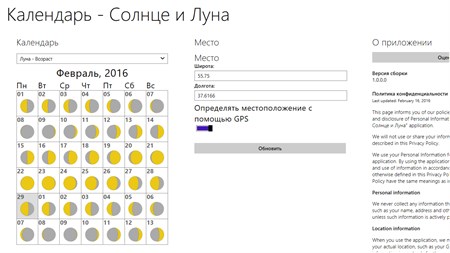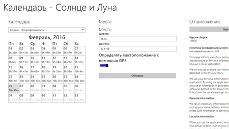 Возможности: * определение положения небесных светил в заданной точке на текущий момент времени (географическое направление, высота над горизонтом) * расчет времени рассвета и заката, астрономического полдня, а так же продолжительности светового дня * расчет времени восхода и захода луны, и момента ее прохождения через наивысшую точку * вычисление временных интервалов для гражданских, навигационных и астрономических сумерек * вычисление оптимального времени для фотографии - "золотой" или "волшебный" час, режимное время - "синий" или "голубой" час * определение текущего местоположения (широта и долгота), и выбор произвольного места по карте * прогноз данных по солнцу и луне на календарной сетке на произвольный месяц * прогноз по фазам луны (новолуние, полнолуние, полумесяц, первая четверть и т.д.), ее освещенность * время ближайшего полнолуния, новолуния