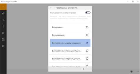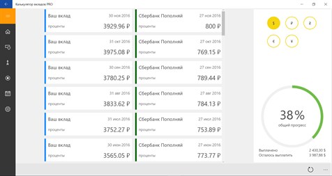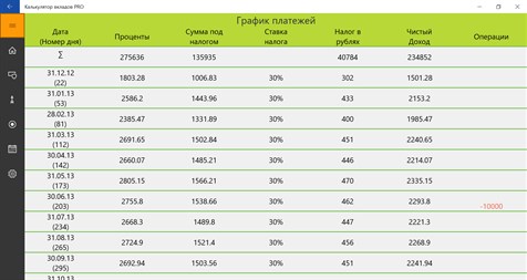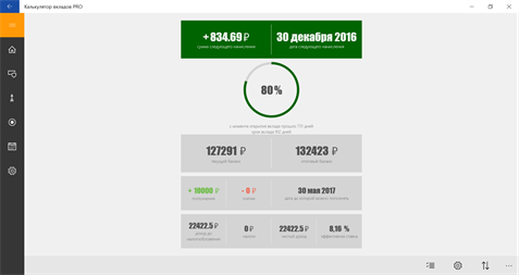 Профессиональны калькулятор вкладов для расчета депозитов ведущих банков РФ: Сбербанк, ВТБ24, Банк Тинькофф, банк Югра, Альфа банк. Расчет происходит с учетом ключевой ставки РФ Учтены особенности налогообложения РФ Точный расчет обеспечивается загрузкой справочников валют, ключевых ставок каждый раз при старте Загрузку можно отключить в настройках