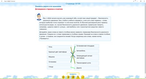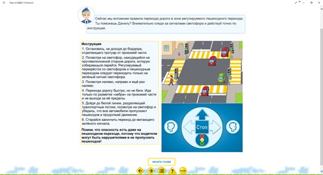Электронный интерактивный курс по безопасности дорожного движения для школьников 1-4 классов призван объяснить правила дорожного движения ученикам младших классов и научить их ориентироваться в различных дорожно-транспортных ситуациях, сформировать у них культуру безопасного поведения на дорогах, улицах и в транспорте. Большое количество разнообразных интерактивных упражнений помогает закрепить полученные знания на практике. Задания на основе конкретных жизненных ситуаций, с которыми школьники сталкиваются каждый день, а также бонусная система поощрений за правильно выполненные упражнения делают обучение занимательным и интересным, а потому – эффективным. Учебный курс может быть рекомендован для работы как в классе, так и для самостоятельного изучения.