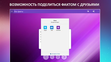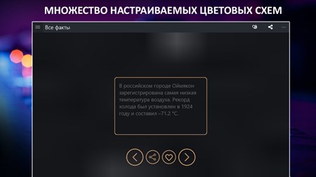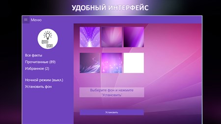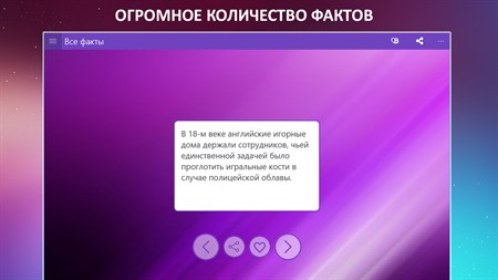 Огромное количество тщательно отобранных фактов обо всем: искусство, достижения человека, рекорды, природа, страны и т.д. База постоянно обновляется уникальными и проверенными фактами! Приложение имеет удобный и понятный интерфейс а также возможность самому выбирать подходящее оформление и цветовую гамму. С этим приложением Вы всегда будете интересным собеседником!