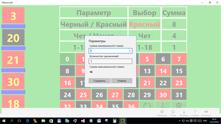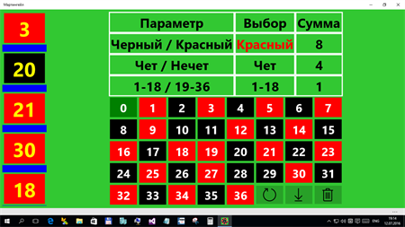 Приложение для подсчета ставок в рулетку по методу мартингейл. В рулетке мартингейл используют в основном при ставках на «равные шансы»: красное/чёрное, чётное/нечётное. При этом в случае проигрыша каждая последующая ставка равна удвоенной предыдущей.