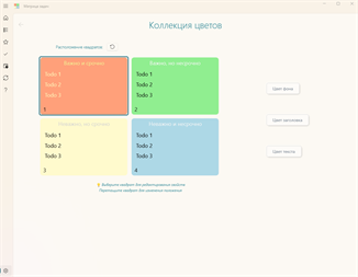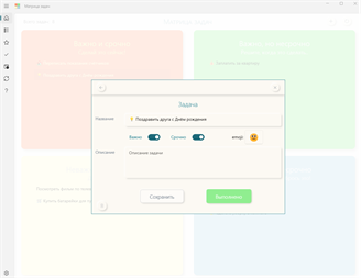 Основные возможности приложения: -Добавление, изменение, удаление задач; -Управление основными признаками задач: Важно и Срочно; -Автоматическое разбиение задач на 4 группы; -Возможность непосредственного (визуального) перетаскивания задач из одной группы в другую; -Возможность изменять расположение групп задач по своему усмотрению; -Возможность изменять названия групп задач; -Возможность посмотреть как общий список задач, так и сгруппированный список; -Красивая плавная анимация; -Поддержка тем Windows; -Поддержка пользовательских цветов в Windows; -Поддержка нескольких языков -Возможность создавать напоминания -Список идей -Возможность настройки цветового оформления квадратов -Стиль "неоморфизм" -Красивая анимация -Готова к Windows 11 -Синхронизация с облачным сервисом