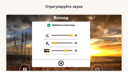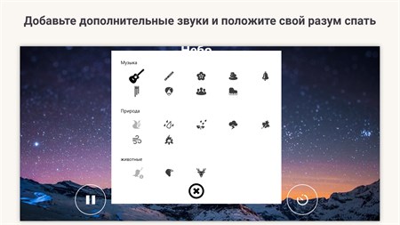 Надежное микширование звука: ★ Животные: поющие птицы, олень, ворона ★ Музыкальные инструменты: фортепиано, гитара, флейта, колокольчики, колокольчики ★ Звуки природы: текущая река, небольшой дождь, ливень, гроза, шелест листьев, тоскливый ветер, потрескивающий огонь.
