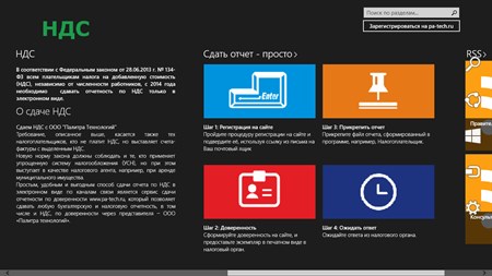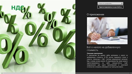 Приложение представляет сервис pa-tech.ru для сдачи бухгалтерской и налоговой отчетности в Федеральную налоговую службу и сдачи отчетов в Фонд социального страхования. В приложении Вы можете найти материалы о налоге на добавленную стоимость. В RSS лентах содержатся статьи и новости, связанные с НДС. Система уведомлений напомнит Вам о сроках уплаты налога. Из приложения Вы также можете зарегистрироваться на сайте www.pa-tech.ru (сайт предназначен для сдачи бухгалтерской и налоговой отчетности) и получить абонемент на 1 месяц бесплатно.