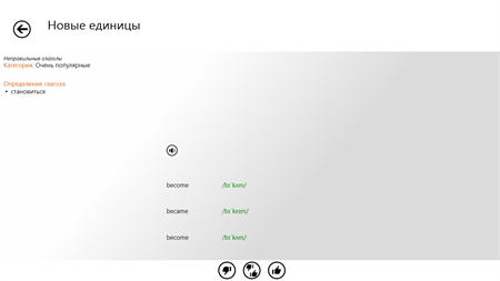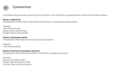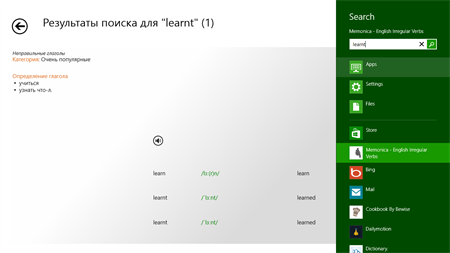 "Мнемоника – английские неправильные глаголы" – это программа для обучения английскому языку. Благодаря примененному в программе очень эффективному методу Spaced Repetition, вы быстро узнаете все исключения среди глаголов и, что важнее, эти знания прочно останутся в вашей голове!