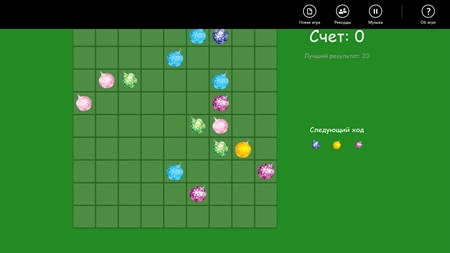 На игровом поле 9x9 клеток располагаются разноцветные новогодние шарики, количество которых с каждым ходом увеличивается на 3. Задача - собирать как можно больше елочных шариков одинаковой раскраски, числом не менее пяти штук, в одну линию.