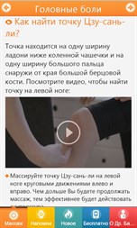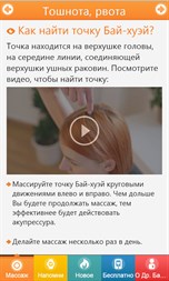√ Вам больше не понадобятся требующие много времени визиты к врачу. √ Не понадобятся ощутимые денежные затраты. √ Отпадёт опасность внесения инфекции, повреждений тела или болей. √ Вы мягко массируете точки пальцем руки. √ Приложение автоматически напомнит Вам о нужном моменте массажа.