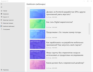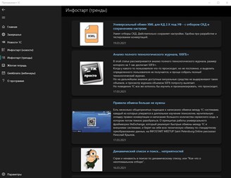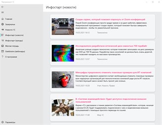 На данном этапе приложение обладает следующим функционалом: - показывает страницу "Заметки из Зазеркалья"; - показывает список новостей от фирмы 1С; - показывает новости и тренды с сайта Infostart; - показывает избранные посты и статьи из телеграм-канала "Жёлтая тетрадь" (блог программиста 1С) - показывает расписание ближайших вебинаров с сайта Geekbrains;