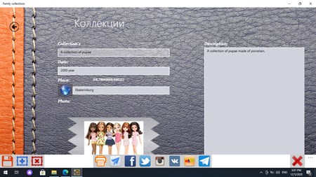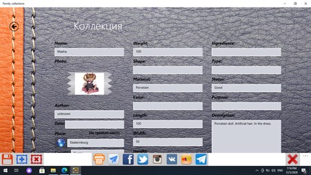 Функции программы: - подробное описание предмета коллекции - фотографии и видео предмета коллекции - копии документов о предмете коллекции - отправлять информацию из приложения на E-mail, Instagram, Facebook, Twitter, VKontakte - чат между пользователями приложения через Telegram - просматривать информацию с eBay - печать отчетов и фотографий с разделением на страницы