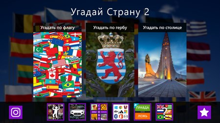 Занимательная развивающая игра Угадай Страну 2 позволит вам расширить свой кругозор и с интересом провести время! Угадывайте страны по флагу, гербу или столице, испытайте себя и свои знания географии ;)