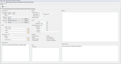 Программа разработана прежде всего для риэлторов и людей, работающих с недвижимостью. Программа упростит рутинную работу по учёту продаваемых или сдаваемых в аренду объектов, учёту поступающих запросов, а также базы данных клиентов.