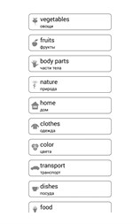 Эта увлекательная и развивающая игра является мобильным репетитором для самостоятельного изучения лексики и фонетики начального уровня. Список слов специально подобран из различных тем, используемых в повседневной жизни. Данный самоучитель позволяет эффективно научиться правильному произношению и написанию, за счет наличия визуального и аудио сопровождения. Для лучшего освоения материала обучение построено в несколько этапов игры: • Тренинг - запоминание алфавита, существительных, прилагательных, глаголов с транскрипцией при помощи карточек и звукового сопровождения. • Тестирование и проверка выученных слов организована в виде веселых, легких и понятных игр: 1. Чтение и ассоциация: выбор правильного варианта слова к картинке. 2. Визуализация: выбор динамически движущихся изображений к списку слов. 3. Тест на правописание: написание слов и проверка орфографии. Простота интерфейса, поддержка HD планшетов, красочные тематические фотографии, а также качественное озвучивание носителем языка улучшают восприятие на слух и позволяют сосредоточить внимание на учебном материале, что является залогом хорошего и быстрого усвоения информации. Полный список тематических групп: овощи, фрукты, дикие животные, домашние животные, дом, одежда, цвета, транспорт, части тела, посуда, бытовая техника, еда, игрушки, школа, природа, насекомые, цифры, геометрия, музыкальные инструменты, морская жизнь, инструменты, спорт, ванная комната, путешествие, инфраструктура, офис, разное. Благодаря этому Вы или Ваш ребенок может в интересной игровой форме пополнить словарный запас иностранных слов, что является фундаментом к качественной устной и письменной речи. Интерактивное (адаптивное) преподавание - лёгкий и доступный способ изучить языковые уроки. Для детей это приложение не только быстрый и простой способ научиться говорить и писать, но и совершенствование знаний полученных в школе или детском саду. Родители могут использовать это приложение в качестве дошкольных уроков по методу Глена Домана для своих малышей.