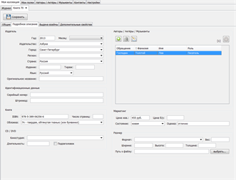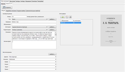 Программа предлагает Вам простой способ управлять своими книгами, компакт-дисками и другими предметами. Управляемые предметы могут быть упорядочены под категории и подкатегории. В программе предложены категории по умолчанию, а также возможно добавить свои собственные категории. Программа позволяет ввести для каждого предмета многочисленные характеристики, такие как издательство, ИСБН-код для книги или формат и продолжительность для компакт-диска. Кроме того, возможно определение собственных характеристик. В программе возможна фильтрация управляемых объектов по введенным значениям. К описанию каждого предмета могут быть добавлены изображения в неограниченном количестве.