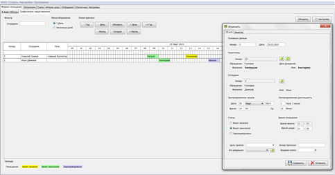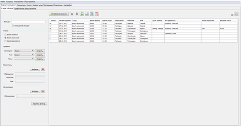Любая сделанная запись может иметь статус с определенными значениями: зарезервировано, визит начался/закончился. В зависимости от потребностей той или иной фирмы, в журнале посещений можно устанавливать свои фильтры по необходимым параметрам: статус, дата, посетитель и т.д.