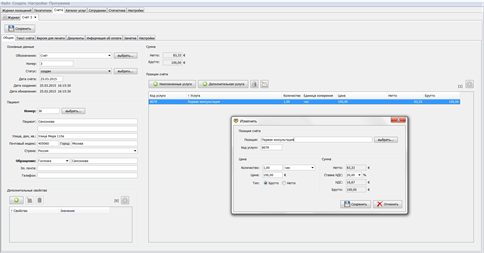 Благодаря данной программе предоставляется возможность оказывать всем посетителя разные услуги, а также выписывать счета. Последние можно распечатывать (при необходимости) в PDF-формате. Для ведения статистики в программе предусмотрены специальные и удобные возможности. Так, можно будет легко просматривать, кто и в каком количестве наносил визиты.