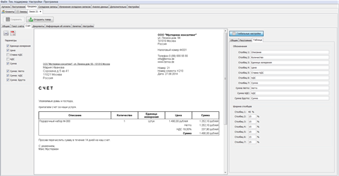 В программе возможно лёгкое создание своих собственных накладных или счетов-фактур с колонтитулом и логотипом. Расстояние между линиями и отображаемыми столбцами Вы можете определять также самостоятельно. Конечно, Вы можете также использовать готовые шаблоны, и Вам нужно будет всего лишь ввести свои данные. Программа поддерживает в счетах-фактурах различные налоговые ставки. Все документы нумеруются в программе автоматически, также номера документов могут быть заданы вручную.