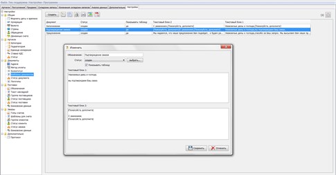 Также в программе имеется диалог со списком заказов. В этом списке Вы можете добавить новый заказ или изменить имеющийся. К каждому заказу можно добавить различные документы, такие как счёт, коммерческое предложение или подтверждение заказа. Каждый заказ может иметь свой статус. Список доступных статусов также может быть легко задан пользователем.