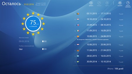 На основании дат предыдущих въездов и выездов программа рассчитывает, соответствует ли общее пребывание в Шенгенской зоне правилу 90/180-дней, и определяет максимально возможный срок оставшегося разрешенного периода пребывания начиная с предполагаемой даты въезда.