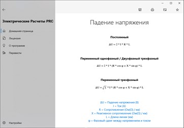 Преобразования: Преобразование Δ-Y [PRO], Преобразование мощности, Таблица преобразования AWG, Таблица преобразования SWG, Imperial / metric conductor size comparison, Преобразование сечения, Преобразование длины, Преобразование напряжения (Амплитуда), Преобразование sin/cos/tan/φ [PRO], Преобразование энергии, Преобразование температуры, Преобразование давления, Преобразование А•ч/кВт•ч, Преобразование вар/мкФ [PRO], Преобразование Гаусс/Тесла, Преобразование RPM (об/мин) - рад/с - м/с, Преобразование частоты / угловой скорости, Преобразование крутящего момента, Преобразование битов и байтов, Преобразование угловых мер.