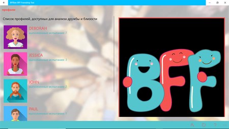 Для каждого друга вы можете найти ответ на следующие вопросы: - проверить дружбу: Кто мой лучший друг навсегда? - тест про дружбу: Кто больше похож на вас в эмоциональном плане? - тест на дружбу: Какой друг ближе ко мне в психологическом плане? - Кто из моих друзей наиболее совместим со мной в эмоциональном плане? - Кто из моих друзей наиболее близок со мной в когнитивном плане? - тест на дружбу: Насколько хорошо вы меня знаете?