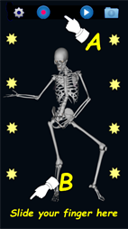 Dancing Bones. Tap on Bones or the screen to see his moves. Tap parts of his body to hear him talk. Tap different areas for different dance moves. Tap rapidly on the screen for DJ effects! Run your finger along the dance slider to control his moves. Record and save your own custom dances. •Great for family Halloween fun! •Watch Bones Dance •Tap different areas of the screen to see his different moves •Use the dance slider to riff on any dance move •Rapid tap for DJ effects •Record, save and playback custom dances •Great fun for the whole family
