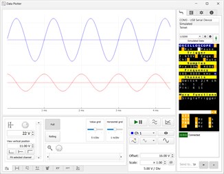The capabilities of DataPlotter are similar to oscilloscopes, it can plot the data (obviously), perform FFT and automatic measurements, and save data to a CSV file or as an image. There are also cursors and XY modes. The plot can operate either in oscilloscope mode (data received as an array of samples captured over a short time period) or in rolling mode (data received point-by-point and continuously appended to previous data over a long time period). There is also support for logic (digital) channels.