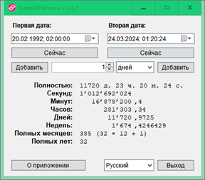 Этот инструмент рассчитывает разницу между датами. Он позволяет отобразить разницу в: - секундах (целое число) - минутах (с дробной частью) - часах (с дробной частью) - днях (с дробной частью) - неделях (с дробной частью) - полных месяцах (с дробной частью) - полных годах (с дробной частью) - полном формате: ДДД;ЧЧ:ММ:СС