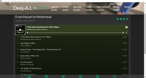 Discover new music using Artificial Intelligence to automatically generate playlists based on how the music sounds. Create your own musical journey that smoothly "joins the dots" between the songs that you choose (for example, from Mozart to Motörhead). Try playing around with the creativity parameter.