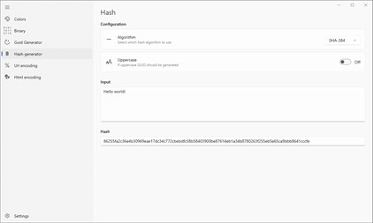 A collection of useful developer tools, including: - Hexadecimal decoder (primitive types, little endian, big endian) - GUID generator - Hash generator (MD5, SHA-1, SHA-256, SHA-384, SHA-512) - Color picker & color collection - Base64 Encode/Decode - Url Encode/Decode - HTML Encode/Decode