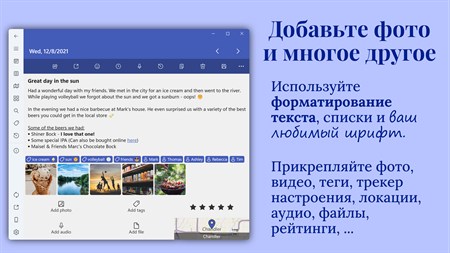 Самое функциональное приложение журнала для Windows позволяет хранить все ваши драгоценные воспоминания в одном месте и даже напоминает вам о необходимости каждый день записывать свои впечатления.