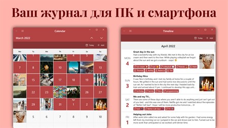 • Самое многофункциональное приложение для личного журнала и дневника для всех платформ, в т.ч. Облачная синхронизация* • Ведите дневник на всех своих устройствах: ПК, ноутбуке, планшете или телефоне* • Ежедневные уведомления напоминают вам о необходимости записать свои воспоминания • Прикрепляйте изображения, аудиозаписи, файлы, теги, людей, рейтинги или местоположения к своим записям в дневнике. • Безопасность и конфиденциальность: заблокируйте свой журнал/дневник с помощью пароля, PIN-кода и Windows Hello. • Используйте маркированные списки и форматирование текста в своем журнале. • Создавайте шаблоны дневников и вставляйте их в 2 клика • Автоматическая интеграция вашей активности в социальных сетях (Instagram, Facebook, …) и вашей активности в фитнесе (Google Fit, Fitbit, Strava, …) • Резервное копирование вашего дневника с импортом и экспортом базы данных • Простая миграция из существующего приложения для ведения журнала, например. Diaro, Journey, Day One, Daylio и многие другие • Экспортируйте записи журнала в формате .docx, .html, .json или .txt. • Идеальный дневник путешествий: пересмотрите свои путешествия на карте мира.