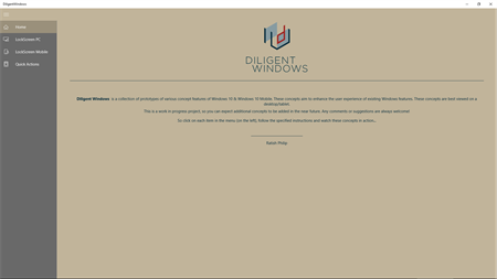 DiligentWindows is a collection of prototypes of various concept features of Windows 10 & Windows 10 Mobile. These concepts aim to enhance the user experience of existing Windows features. These concepts are best viewed on a desktop/tablet. This is a work in progress project, so you can expect additional concepts to be added in the near future. Any comments or suggestions are always welcome!