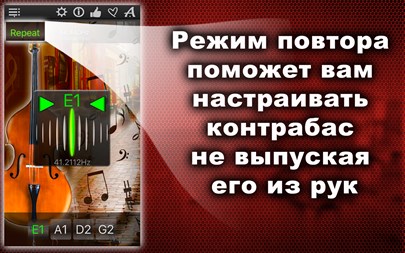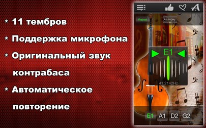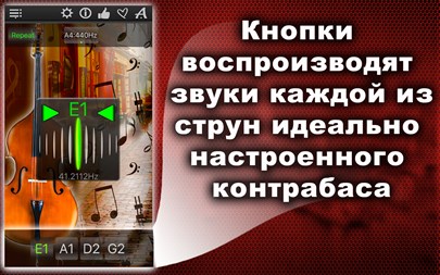 БЕСПЛАТНО пробуйте 1 день! Настройте Ваш контрабас быстро и точно! Простой и мощный тюнер поможет Вам в этом! Вы можете не только прослушивать звук каждой настраиваемой струны, но также проверить правильность настройки и "отшлифовать" её с помощью хроматического тюнера, который расположен в середине окна приложения! Апп-функции: * Хроматический тюнер с аудио-входом и поддержкой микрофона, * Генератор тона с оригинальным звучанием контрабаса, * Автоматическое повторение проигрываемых звуков, * 11 тембров: + Барокко, + Научный, + Франция 1859, + Новый филармонический, + Концертный, + Бостонский симфонический, + Новый Берлинский, + Московский театральный, + Старый Берлинский филармонический, + Старый филармонический, + Ренессанс.