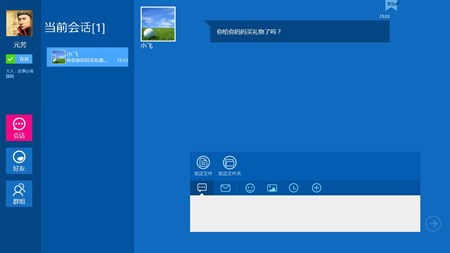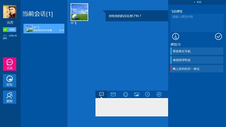 Windows8版飞信己具备功能: 支持中国移动、中国联通、中国电信或者邮箱用户注册使用; 二人会话能力 独有免费短信能力(目前接收方仅限中国移动用户);