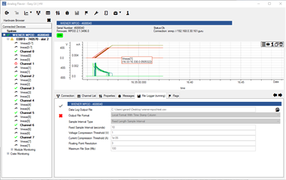 After selecting an item in the hardware browser, the measured voltages and currents are visualized in a graph window. Temperatures and computed power can be visualized by dragging the corresponding item to the graph window. Events from the message window are annotated to the curves when selected.