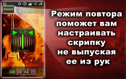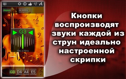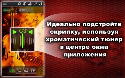 БЕСПЛАТНО пробуйте 1 день! Настройте Вашу скрипку быстро и точно! Простой и мощный тюнер поможет Вам в этом! Вы можете не только прослушивать звук каждой настраиваемой струны, но также проверить правильность настройки и "отшлифовать" её с помощью хроматического тюнера, который расположен в середине окна приложения! Апп-функции: * Хроматический тюнер с аудио-входом и поддержкой микрофона, * Генератор тона с оригинальным звучанием скрипки, * Автоматическое повторение проигрываемых звуков, * 11 тембров: + Барокко, + Научный, + Франция 1859, + Новый филармонический, + Концертный, + Бостонский симфонический, + Новый Берлинский, + Московский театральный, + Старый Берлинский филармонический, + Старый филармонический, + Ренессанс.