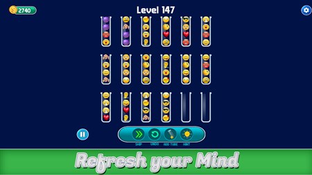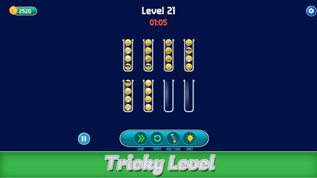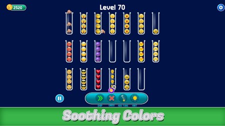 HOW TO PLAY: - Tap any tube to move the ball lie on top of the tube to another tube. - The rule is that you can only move a ball on top of another ball if both of them have the same color and the tube you want to move into has enough space. - Try not to get stuck - but don’t worry, you can always restart the level at any time.