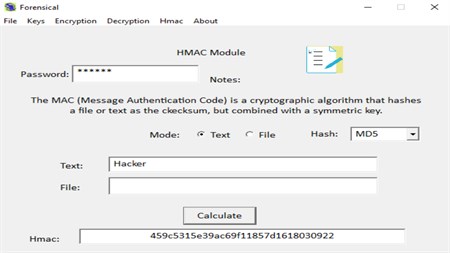 Forensical is a software that provides Cryptographic routines, written in C++ language and built with own technology, including: Symmetric Cryptography (AES, DES, etc.), Encryption and Decryption routines, MAC Calculations (HMAC with MD5, SHA-256, and more...