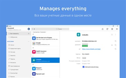 ВЫБЕРИТЕ СВОЕ САМОЕ БЕЗОПАСНОЕ МЕСТО ДЛЯ ХРАНЕНИЯ ПАРОЛЕЙ И КЛЮЧЕЙ ДОСТУПА Enpass считает, что ваши данные принадлежат вам. В отличие от большинства менеджеров паролей, которые хранят все пароли пользователей на центральном сервере, Enpass дает вам возможность выбирать, где хранить и синхронизировать ваши зашифрованные хранилища. ● Enpass работает с OneDrive, iCloud, Google Drive, Box, Dropbox, NextCloud, WebDAV или полностью автономно. ● И с поддержкой хранения и синхронизации ключей доступа между устройствами, Enpass готов к беспарольному будущему. ПОЧЕМУ ENPASS БЕЗОПАСНЕЕ ● Большинство менеджеров паролей хранят хранилища каждого пользователя на собственном центральном сервере, представляя собой заманчивую мишень для хакеров ○ Но в случае с Enpass хакерам придется… ○ Атаковать вас лично ○ Знать, какие облачные сервисы вы выбрали для своих хранилищ ○ Иметь данные доступа к этим облачным учетным записям ○ Пройти многофакторную аутентификацию каждой учетной записи ○ И знать свой мастер-пароль Enpass ● Enpass также включает проверку паролей и мониторинг утечек данных - удобные для пользователя инструменты, которые помогут вам оставаться в безопасности ПОЧЕМУ ENPASS ЛУЧШЕ ● Хранение и синхронизация паролей доступа - готовность к беспарольному будущему ● Хранилища без ограничений - полное разделение рабочих и личных паролей и многое другое ● Настройка каждого элемента - добавляйте, удаляйте и перегруппировывайте поля или создавайте свои (даже многострочные поля) ● Настраиваемый генератор паролей ● Вложения ● Встроенный аутентификатор (TOTP) ● Делитесь отдельными хранилищами — с партнером или командой проекта; помогайте управлять паролями для детей или пожилых родственников. ● Пользовательское расширение браузера — настройте автозаполнение и автосохранение так, как ВАМ нравится, и создайте собственные сочетания клавиш. А ТАКЖЕ ENPASS ДОСТУПЕН ПО ЦЕНЕ ● Десктопная версия Enpass БЕСПЛАТНА для индивидуальных пользователей ● Enpass Premium доступен всего за $1,99/мес, Enpass Family - за $2,99/мес ● Enpass Business доступен от $2,99/мес за пользователя (или фиксированная цена $9,99/мес для небольших команд) ● Посетите сайт enpass.io/pricing для получения более подробной информации. ** ENPASS ТАКЖЕ ЛУЧШЕ ПОДХОДИТ ДЛЯ БИЗНЕСА ● Децентрализованное хранение и синхронизация делают Enpass соответствующим требованиям ● Мощные инструменты безопасности и восстановления, а также возможность обмена с командой в один щелчок ● Автоматическое предоставление доступа и его отключение ENPASS ДОСТУПЕН ПОВСЮДУ ● Enpass работает на Windows, Android, iOS, watchOS, Mac, Linux и во всех основных браузерах. Безопасность ● Шифрование AES-256 с нулевым уровнем доступа для 100% пользовательских данных ● Сертифицированное соответствие стандартам ISO/IEC 27001:2013 ● Быстрая разблокировка с помощью распознавания лица Windows Hello или аутентификации по отпечатку пальца. ● Быстрая разблокировка с помощью PIN-кода ● Разблокировка с помощью файла ключа как элемент двухфакторной аутентификации Удобство ● Автоматическое заполнение паролей, кодов аутентификации, данных кредитных карт и веб-форм ● Хранение и синхронизация ключей доступа на всех устройствах ● Синхронизация через личные облачные учетные записи или по Wi-Fi ● Запуск при старте системы. ● Мини-окно всплывает повсеместно в системе, доступное с помощью комбинации клавиш. Безопасность паролей ● Генератор паролей
